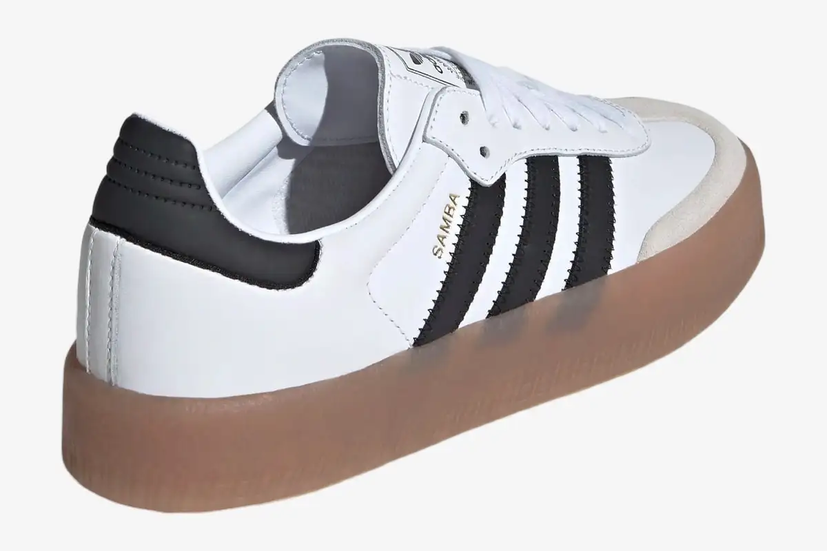 The standout feature remains the exaggerated gum rubber platform sole that adds significant height and presence. This translucent gum unit provides a clean finish that complements the crisp white upper while maintaining the iconic DNA. The platform construction offers a sturdy base that delivers a unique perspective on a timeless indoor soccer design.