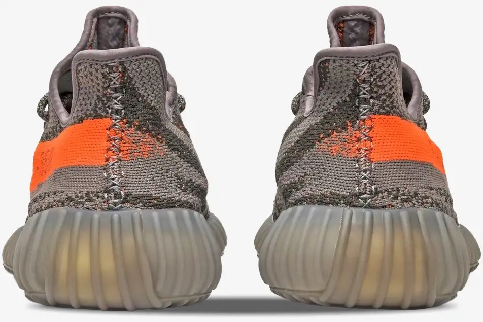 The upper utilizes a complex Primeknit weave blending two shades of grey for a textured, marbled appearance. This intricate pattern provides a premium look while maintaining a breathable, sock-like fit for the wearer. The famous Solar Red stripe cuts through the lateral side to create a sharp contrast against the neutral base. This vibrant orange element defines the Beluga aesthetic and distinguishes it from every other version in the collection. The signature SPLY-350 text sits prominently within the stripe to signal the technical nature of the design.