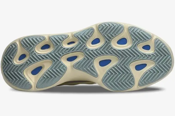 Unlike its predecessors, the V3 Azael replaces traditional Boost cushioning with a lightweight EVA foam midsole. This change allows for a more responsive underfoot feel and a significantly lighter overall weight. The encapsulated EVA core sits within a smooth, cream-colored polyurethane shell for added durability. A herringbone rubber outsole provides reliable traction across various urban surfaces for consistent grip. The blue foam visible through the outsole adds a subtle pop of color to the design.