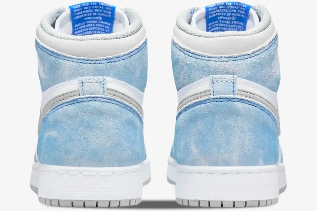The design features washed suede overlays in Hyper Royal that provide a soft, faded appearance across the upper. The Hyper Royal colorway utilizes a unique aging process on the suede to mimic a sun-bleached effect. This treatment ensures that no two pairs look exactly alike due to the natural variations in the material. These distressed panels contrast against the crisp white leather base to create a balanced, airy visual profile. Light Smoke Grey accents on the Swoosh and collar add a neutral touch to the vibrant blue tones.