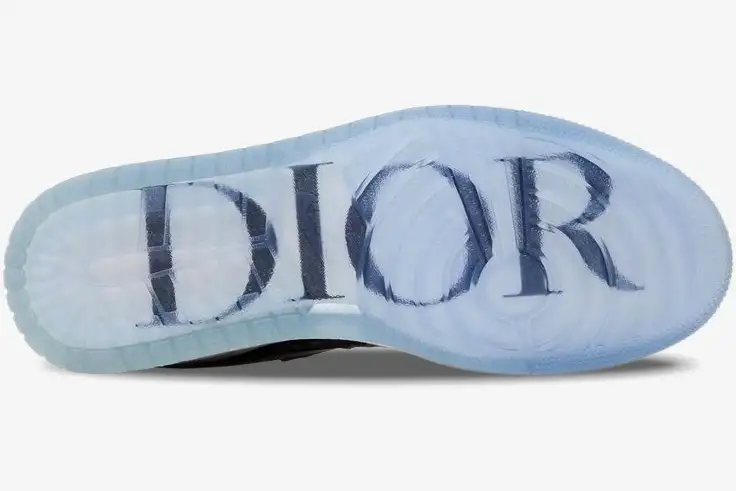 The signature Dior Oblique pattern fills the oversized Swoosh, creating a visual bridge between two legendary brands. An embossed Air Dior logo replaces the traditional Wings branding on the ankle collar for a distinct identity. The translucent outsole reveals co-branded graphics, ensuring the collaboration remains visible from every angle. This design choice emphasizes the prestige associated with both the Jumpman and the Dior monogram.