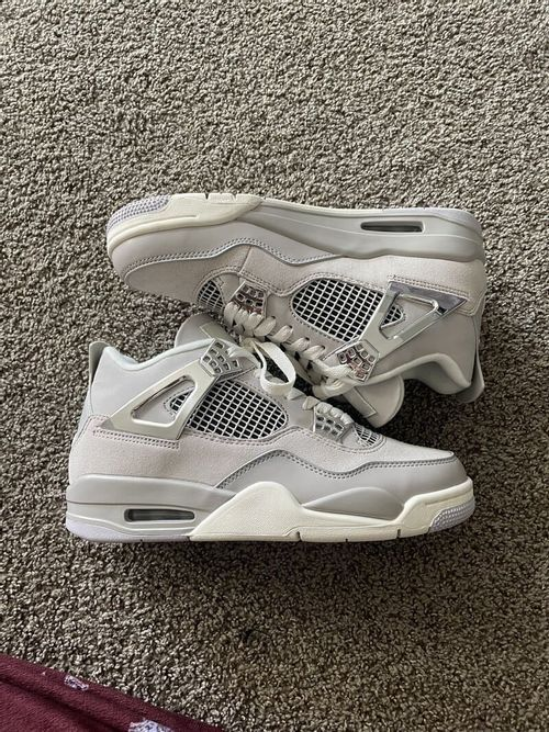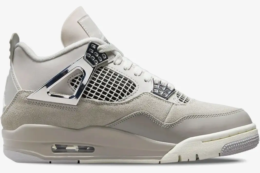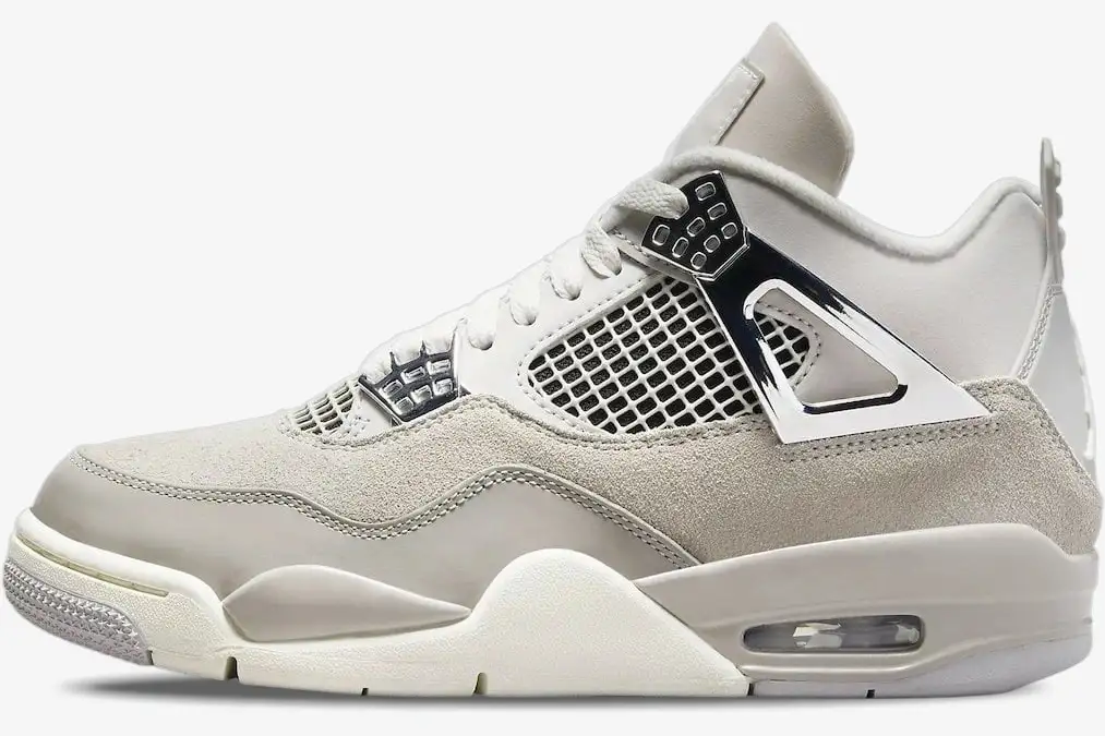 Premium suede and semi-gloss leather panels create a layered look across the upper of this specific release. The traditional mesh netting remains tonal to maintain the sleek, unified appearance of the Frozen Moments design. A visible Air unit in the heel ensures the responsive cushioning expected from the iconic Jordan 4 silhouette. The rubber outsole features a clean white and grey finish to complete the balanced aesthetic.