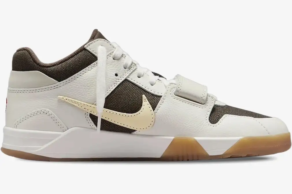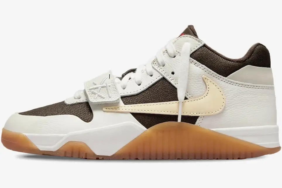 Premium leather overlays wrap around a durable canvas base to ensure long-lasting wear and structural integrity. The Sail and Brown color palette reflects the signature earthy tones found throughout the Travis Scott collaborative catalog. A responsive foam midsole provides essential comfort for all-day use across various demanding urban environments. The rubber outsole extends slightly up the sidewall for enhanced traction and a rugged, industrial appearance. This construction balances lightweight performance with the heavy-duty requirements of a versatile training shoe.