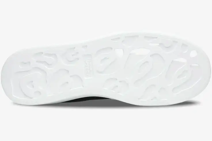 The 2019 edition refines the original 2015 design with precise proportions and updated branding placements. This version features a deep black calfskin leather that creates a seamless visual flow across the upper. The contrast heel tab displays the iconic Alexander McQueen logo in a crisp white font. This specific color blocking emphasizes the exaggerated dimensions that made the silhouette a global fashion staple.