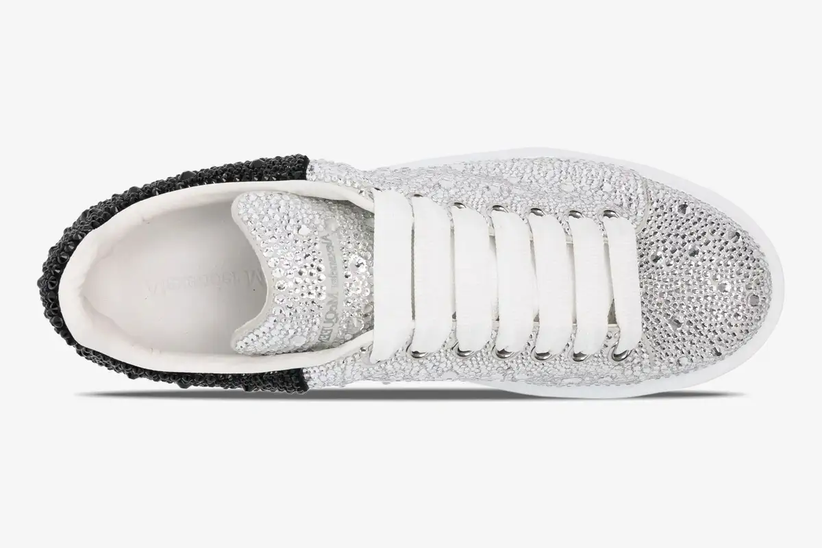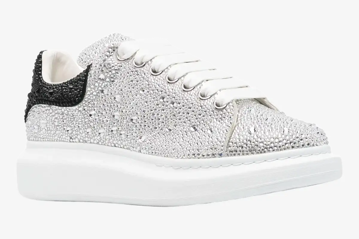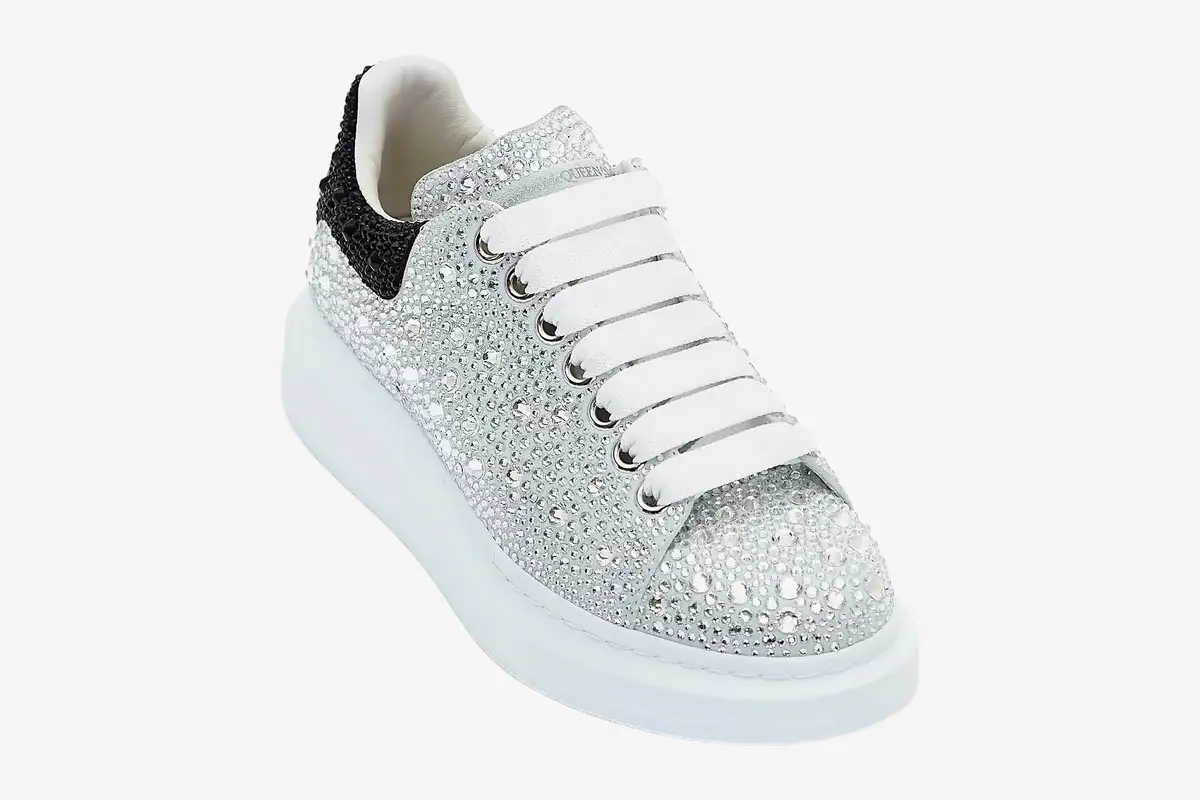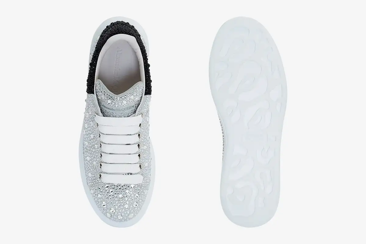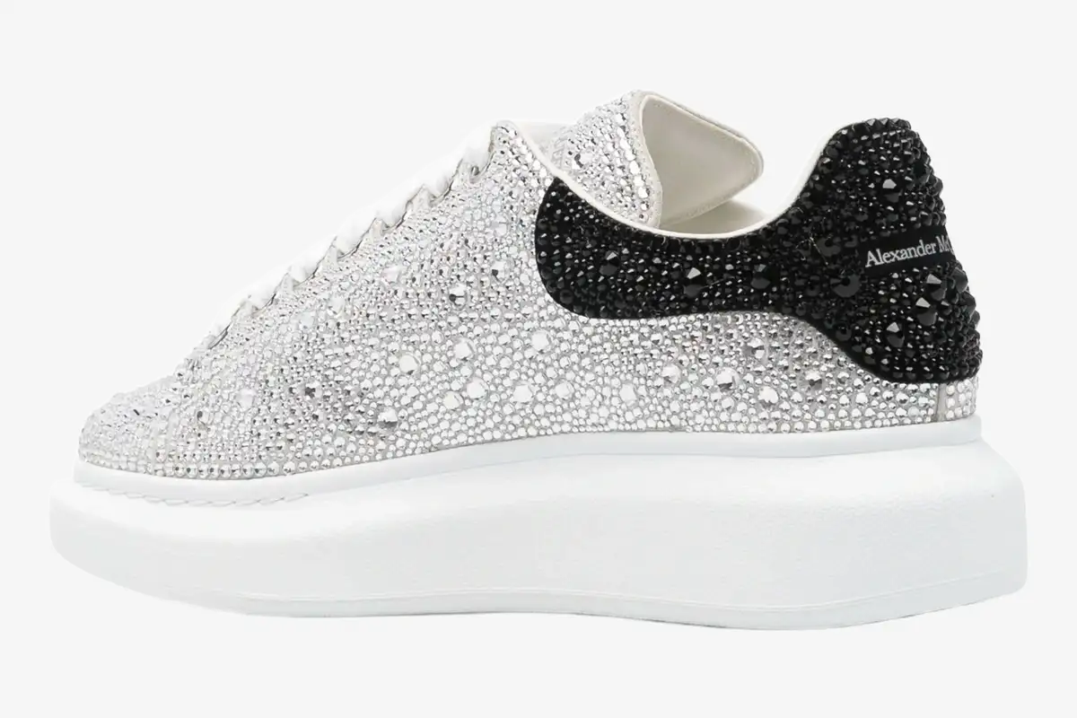 The Alexander McQueen Oversized Sneaker receives a high-glamour update with brilliant crystal embellishments across the signature silhouette. This specific iteration transforms the classic streetwear staple into a luxury statement piece for the modern woman. It caters to those who demand the iconic McQueen profile paired with light-catching, premium details. The design maintains the bold proportions that defined a generation of luxury footwear while adding a sophisticated shimmer.
