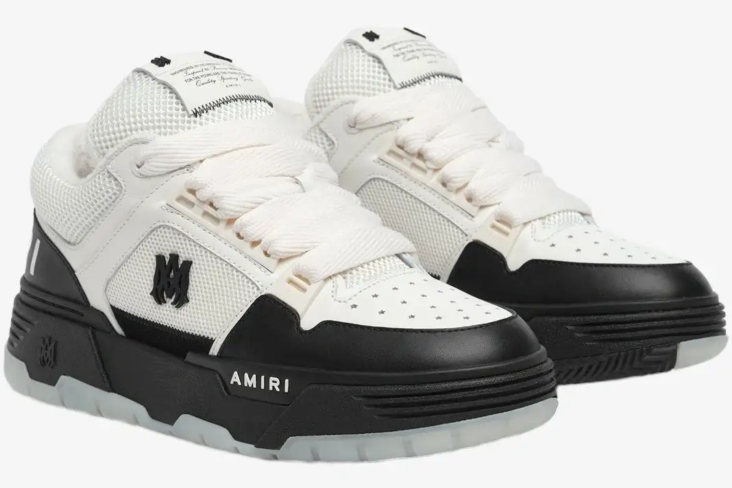 The MA-1 silhouette features a distinctive chunky profile that commands attention through its exaggerated proportions and layered construction. Mike Amiri draws inspiration from vintage athletic gear to create a sneaker that feels both nostalgic and contemporary. The stark contrast between the white leather and black accents highlights the intricate paneling across the upper. Bold logo branding on the side and heel reinforces the premium identity of this signature model. This design represents a sophisticated evolution of the classic bulky skate shoe.