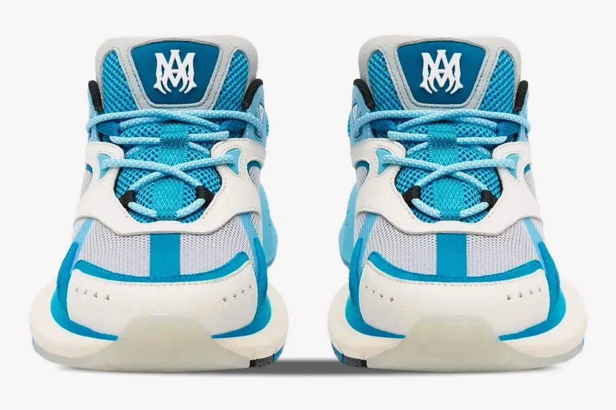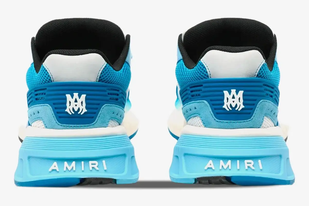 The upper features a technical mesh base layered with premium suede and leather overlays for structural integrity. These materials work in harmony to provide a lightweight feel while maintaining the durability expected from luxury footwear. The iconic logo detail sits subtly on the side, signaling the brand’s heritage without overwhelming the clean design. Every stitch reflects the meticulous attention to detail that defines the Amiri aesthetic. This multi-paneled construction creates depth and visual interest through varying shades of blue across the entire silhouette.