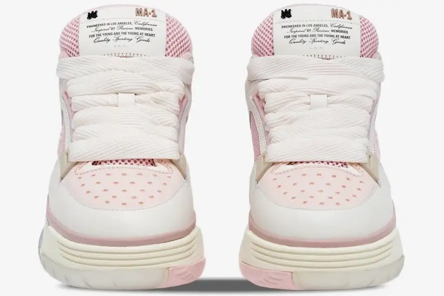 The Amiri MA-1 Sneaker in Pink Alabaster White redefines luxury West Coast skate culture for the modern woman. This specific edition blends soft pastel tones with a maximalist silhouette to create a striking visual statement. The design draws inspiration from 1990s footwear while maintaining a high-fashion sensibility through premium material choices. The Pink Alabaster colorway utilizes a sophisticated palette that balances vibrant accents with neutral undertones. Smooth leather panels meet breathable mesh inserts to provide structural integrity and ventilation across the upper. The perforated toe box enhances airflow while maintaining the classic aesthetic of vintage athletic sneakers.