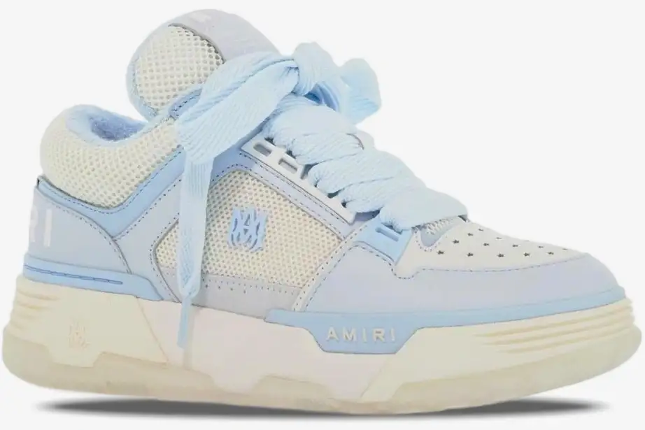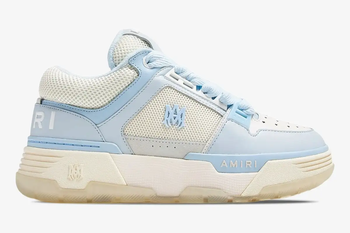 Mike Amiri draws inspiration from 90s West Coast skate culture to create the iconic MA-1 sneaker silhouette. This specific iteration blends high-fashion luxury with the rugged aesthetic of vintage performance footwear found in Los Angeles. The crisp white leather upper provides a clean canvas for the striking blue mesh panels and branding elements. This colorway captures a coastal vibe while maintaining the oversized proportions that define the modern luxury streetwear movement.