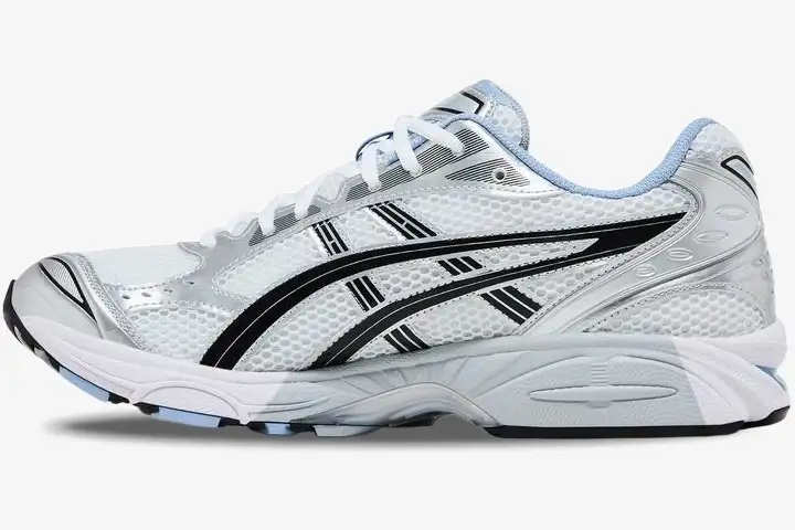 Breathable white mesh forms the foundation of the upper to ensure optimal airflow during daily wear. Metallic silver overlays provide essential structural support while reflecting the Y2K-era aesthetic that defines the Kayano lineage. Synthetic leather panels in a crisp blue hue add a distinct contrast to the monochromatic base. The midsole features signature GEL technology to provide responsive cushioning and impact protection on various surfaces. A padded collar and secure lacing system offer a locked-in fit for consistent comfort.