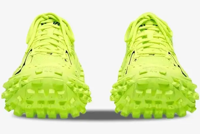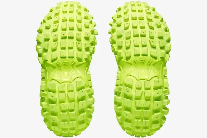 The ‘Fluo Yellow’ colorway covers the entire sneaker, from the technical mesh panels to the massive rubber outsole. A deliberate worn-out effect adds a layer of grit to the neon surface, creating a weathered, industrial appearance. This distressing process ensures that every pair carries a unique, lived-in character right out of the box. The vibrant hue contrasts sharply with the rugged, dirty finish to create a striking visual tension. Balenciaga branding appears discreetly on the tongue and heel to maintain the focus on the silhouette. This version represents a perfect fusion of high-fashion luxury and raw, utilitarian grime.