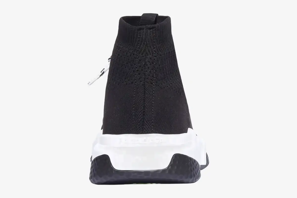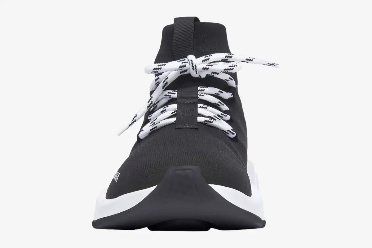 The addition of bi-color laces transforms the streamlined profile into a more complex, architectural statement piece. These laces anchor into the knit fabric to provide a customizable lockdown that the original pull-on version lacks. This version balances the ease of a slip-on with the technical security of a traditional athletic sneaker. The contrasting Balenciaga logo appears on the lateral side to maintain the brand’s signature high-fashion identity.