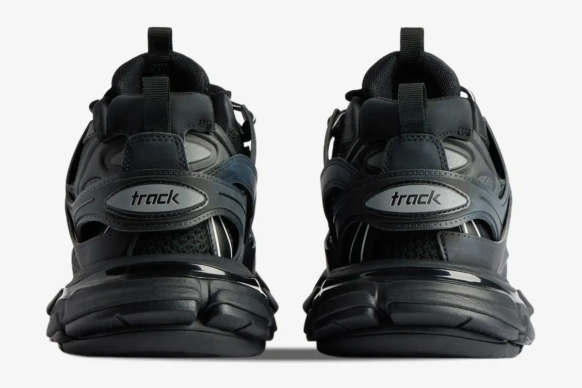 The multi-layered upper utilizes over ninety-six separate components to create a dense, protective cage around the foot. This blacked-out version highlights the intricate overlapping of mesh and nylon panels without the distraction of contrasting colors. The double-laced system provides a secure fit while adding to the signature industrial look of the Track line.