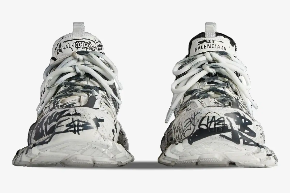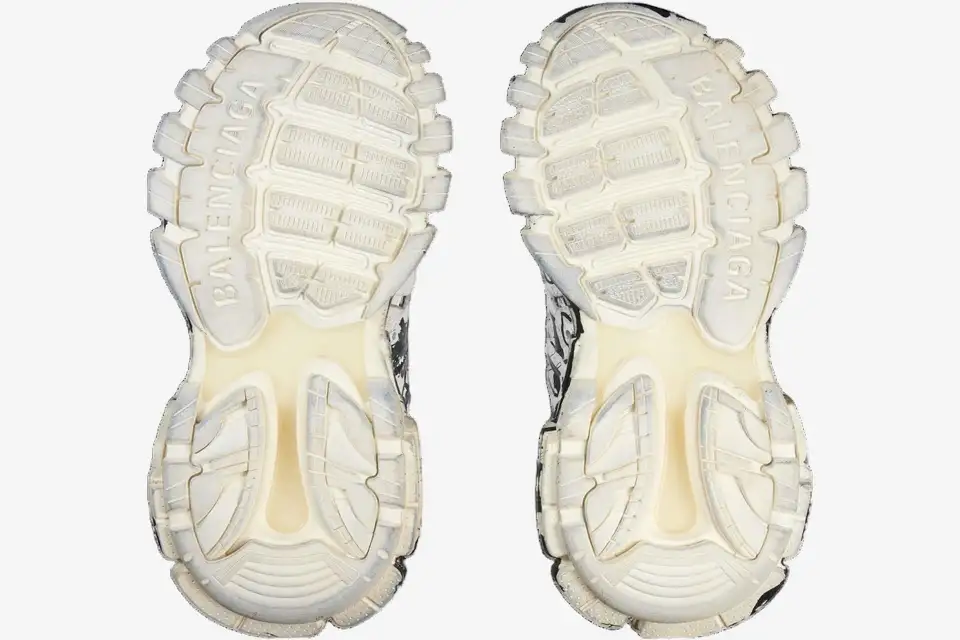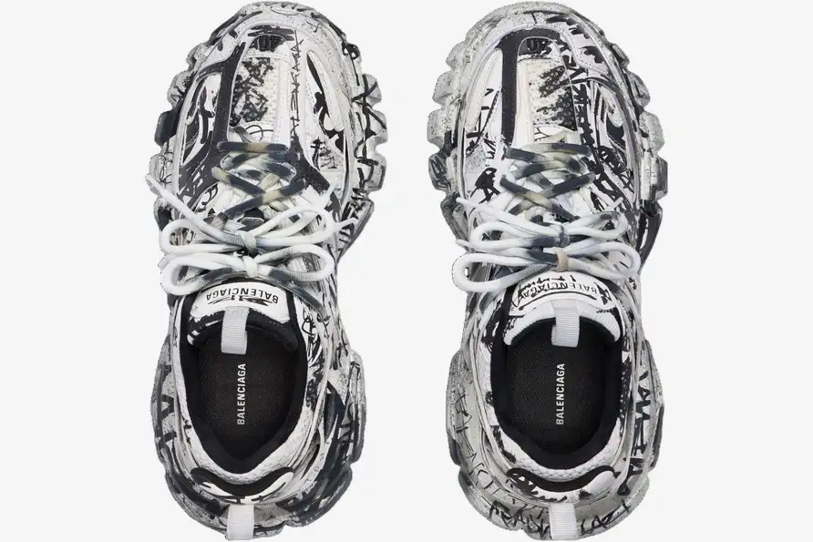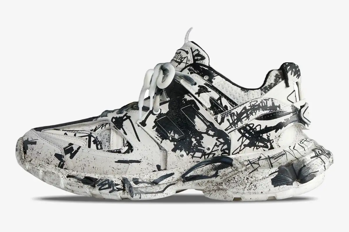 The graffiti print covers the chunky sole unit and extends onto the synthetic overlays of the upper. This design choice reflects the brand’s commitment to subverting traditional luxury norms through DIY-inspired graphics. The black ink creates a sharp juxtaposition against the premium white materials for a high-impact look. This version prioritizes visual storytelling while maintaining the complex architecture of the original silhouette.