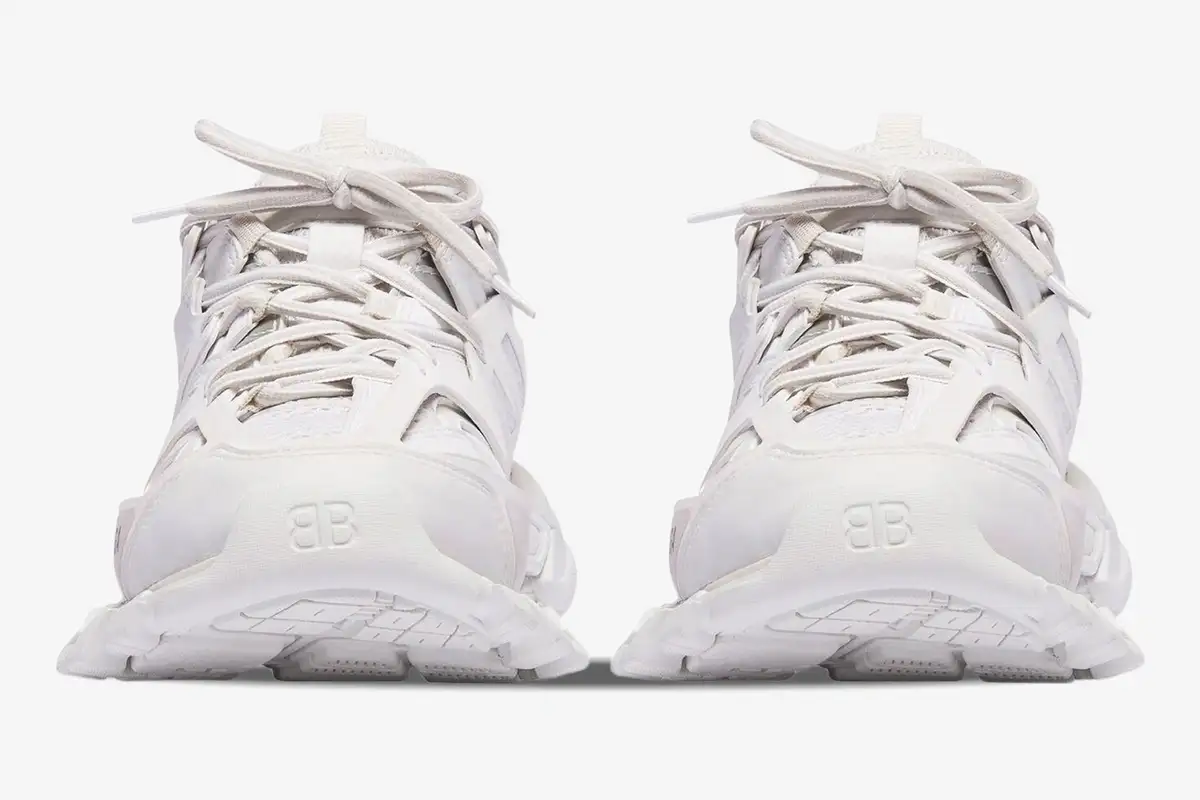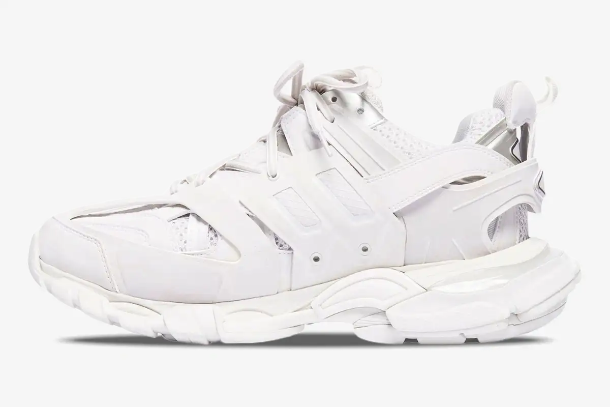 The Balenciaga Track in White redefines the high-fashion hiking aesthetic through a complex, multi-layered construction. This specific iteration focuses on a monochromatic white palette that highlights the intricate architectural design of the silhouette. It serves enthusiasts who appreciate technical complexity paired with a clean, minimalist color scheme. The design bridges the gap between high-performance outdoor gear and luxury streetwear fashion. This version represents the evolution of the chunky sneaker trend into a more technical and functional territory.