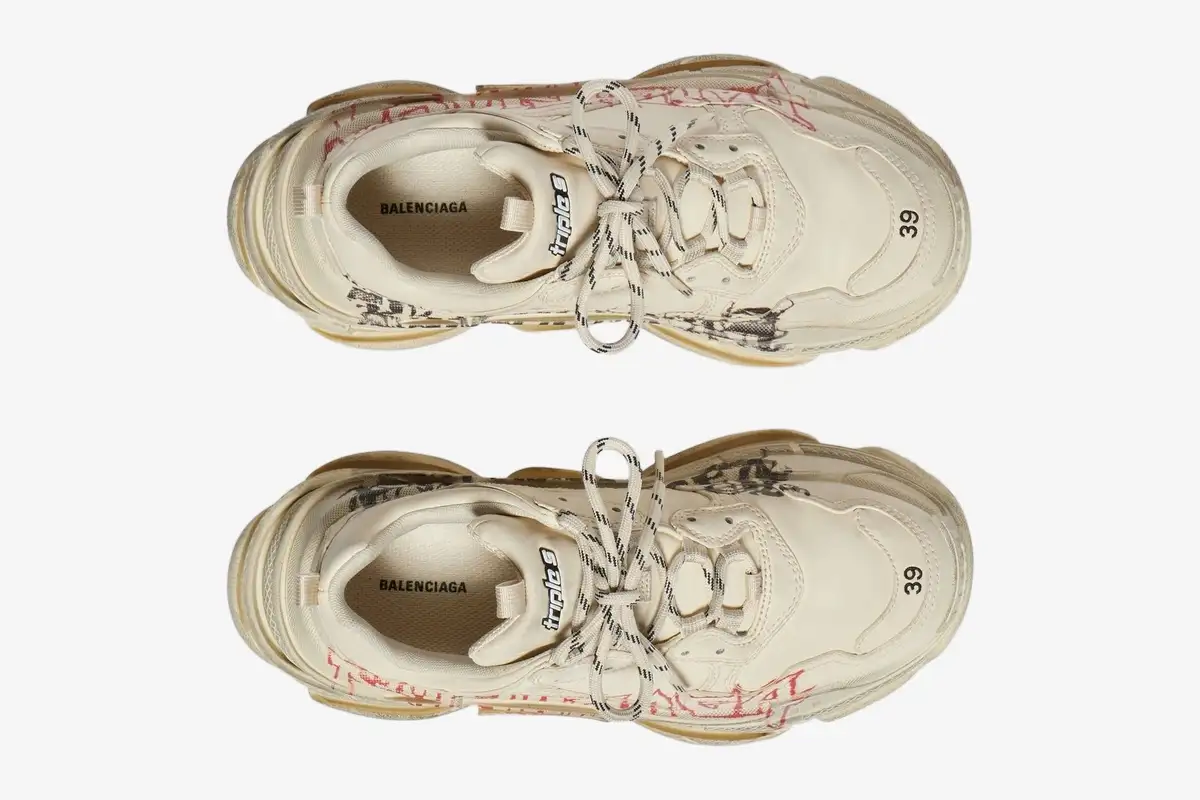 Premium leather overlays meet breathable mesh panels to provide a structured yet flexible fit. The signature three-layered outsole provides the foundation for the distressed white and red colorway. Polyurethane components ensure durability while maintaining the exaggerated proportions that define this specific release. The embroidered logo on the side panel utilizes a sharp font unique to this Diy edition. Pull tabs at the heel and tongue allow for easy entry into the heavily padded interior. This version prioritizes a worn-in look that contrasts the pristine nature of traditional luxury sneakers. Balenciaga pushes the boundaries of the chunky sneaker trend with this aggressive, DIY-inspired iteration.