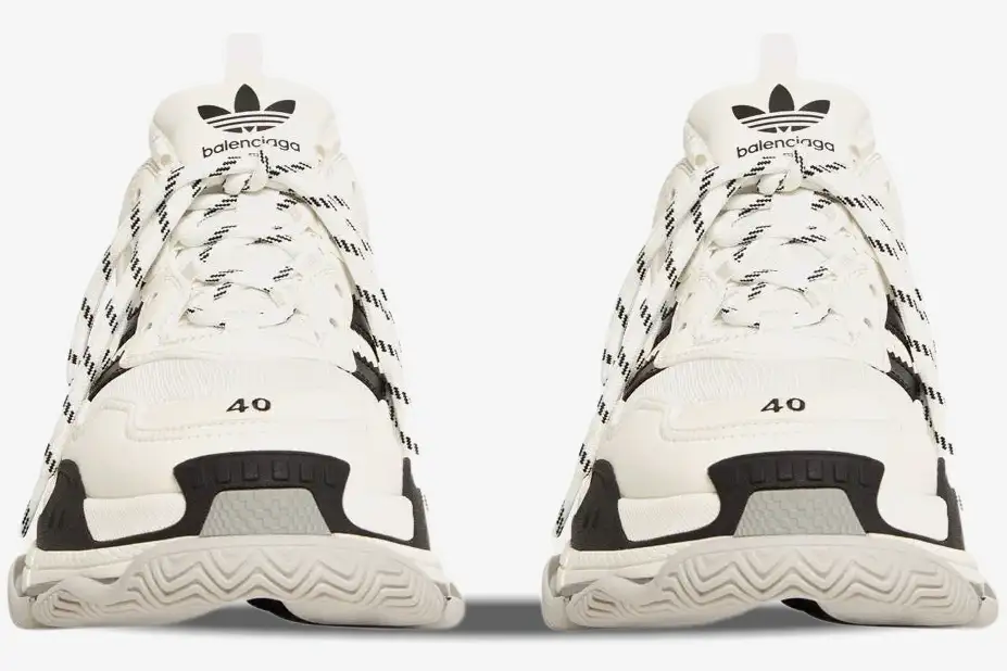 The partnership introduces the Adidas signature three-stripes branding directly onto the side panels of the Triple S model. This collaboration reimagines the legendary chunky sneaker through a lens of German sportswear history. Each pair features the Trefoil logo alongside the Balenciaga name, creating a powerful dual-branded aesthetic. The monochromatic white and black palette emphasizes the clean lines of the Adidas stripes against the complex layered construction. This design choice highlights the synergy between the two brands while maintaining a sophisticated streetwear presence. The collaboration bridges the gap between the runway and the track with effortless style.