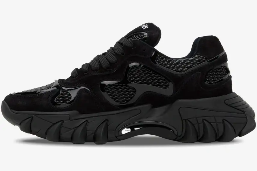 The upper features a complex panelled design that integrates premium suede, smooth leather, and breathable mesh materials. These layers create a structural depth that remains visible despite the uniform black colorway across the entire shoe. Reflective accents and subtle logo details provide a sophisticated touch to the otherwise stealthy and aggressive exterior. The low-top profile ensures maximum versatility while maintaining the substantial presence of a high-fashion statement piece. This specific version prioritizes a tonal aesthetic to highlight the sharp angles and organic curves of the B-East framework.
