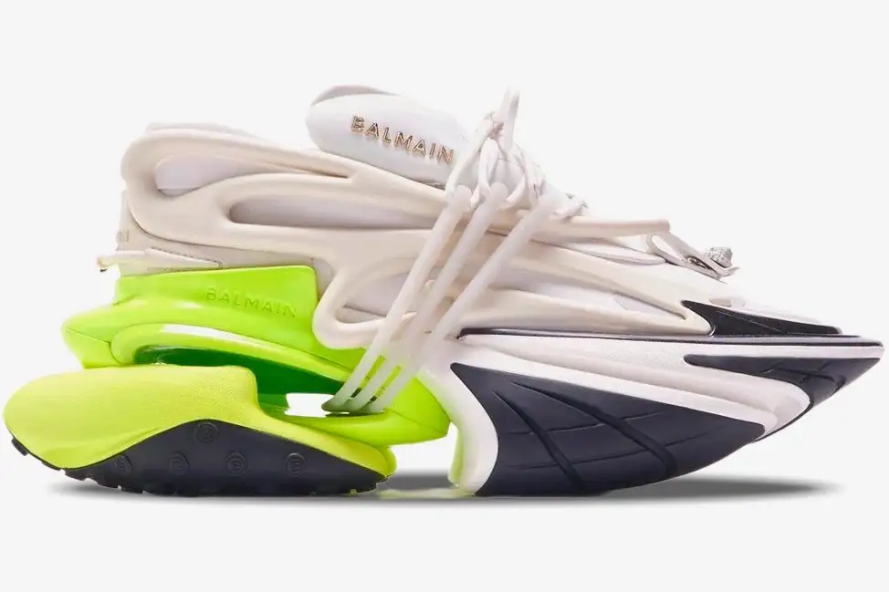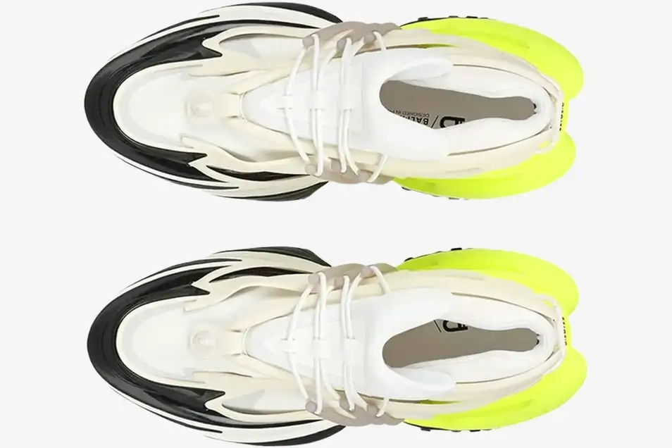 The Balmain Unicorn Low Top in White and Neon Yellow redefines luxury footwear through its aggressive, aerodynamic architecture. This specific colorway pairs a crisp white base with vibrant neon accents to highlight the complex, multi-layered construction. It caters to the modern collector who demands a fusion of high-fashion aesthetics and technical sportswear elements. The silhouette represents a bold leap into futuristic design while maintaining the sophisticated DNA of the historic French house.