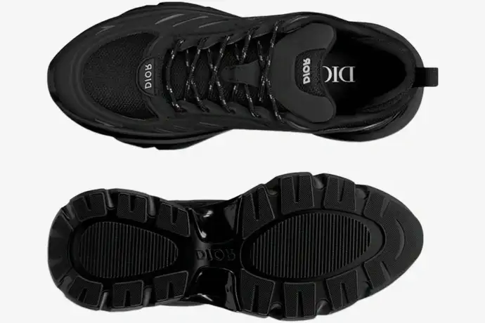 The defining characteristic of this model remains its sculpted, multi-layered midsole that mimics aerodynamic blades. This architectural foundation provides a stable platform while creating a sense of forward motion even at rest. Dior branding integrates seamlessly into the lateral side and heel, asserting its place within the house’s contemporary footwear lineage. The chunky profile delivers a commanding presence that complements modern oversized tailoring and streetwear silhouettes.
