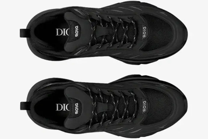 Technical mesh panels form the base of the upper to ensure maximum breathability during daily wear. Synthetic overlays wrap the foot in a cage-like structure, providing essential support and a high-contrast texture against the matte mesh. The tonal black finish highlights the intricate stitching and premium material transitions throughout the entire construction. These lightweight materials reduce overall weight without compromising the durability expected from a premium Dior product.