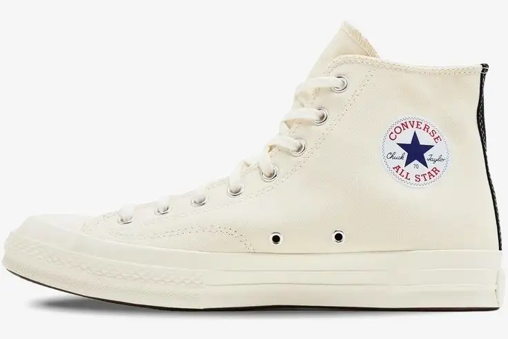 The Converse Chuck Taylor All Star 70s x Comme des Garçons Play High merges classic American heritage with Japanese avant-garde design. This collaboration transforms the traditional basketball silhouette into a recognizable icon of high-fashion streetwear. Rei Kawakubo’s creative vision brings a playful yet sophisticated aesthetic to the durable canvas upper.