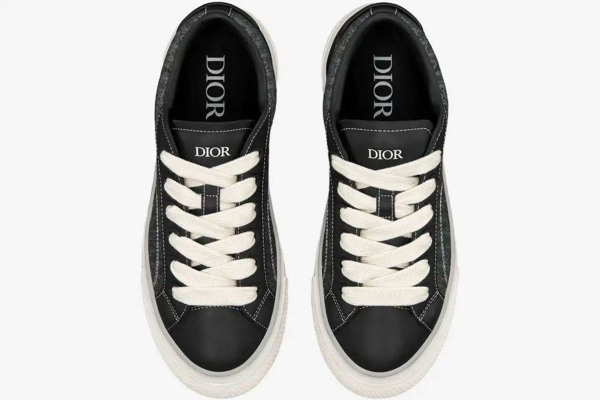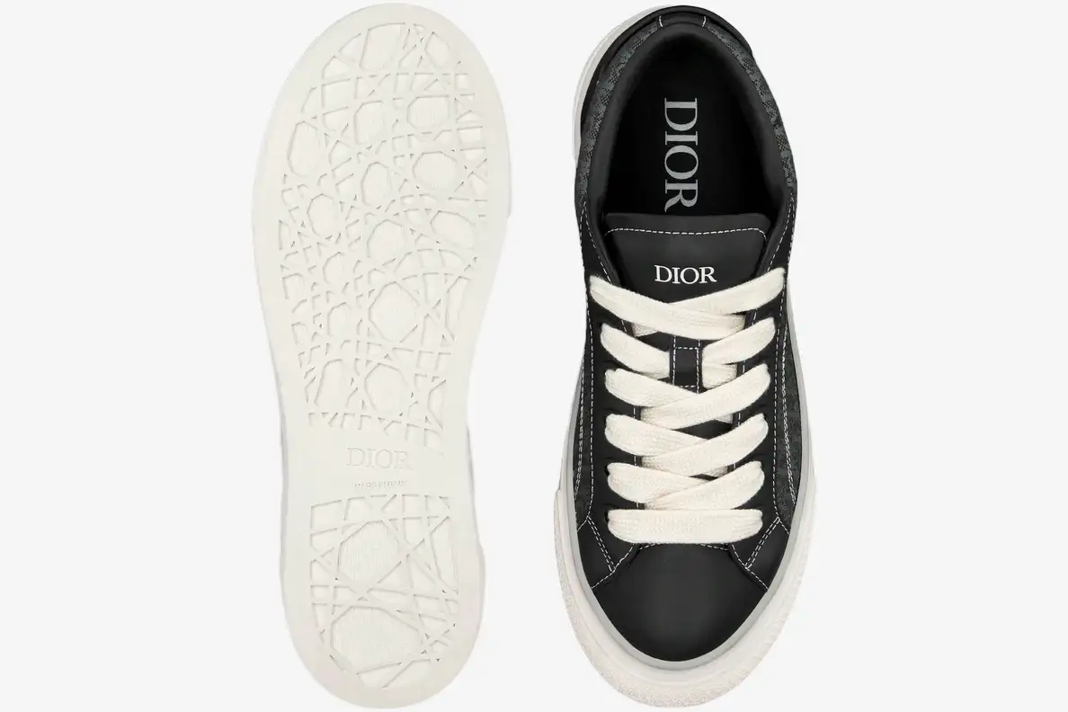 Premium black smooth calfskin inserts provide structural integrity while maintaining a sleek, monochromatic appearance. These leather panels wrap the toe and heel to ensure durability during daily wear. The thick rubber sole offers a stable foundation and reflects the chunky aesthetic of current footwear trends. This sole unit includes an embossed Dior signature on the lateral side for a subtle branding touch. The cream-colored outsole provides a vintage-inspired contrast to the dark upper materials.