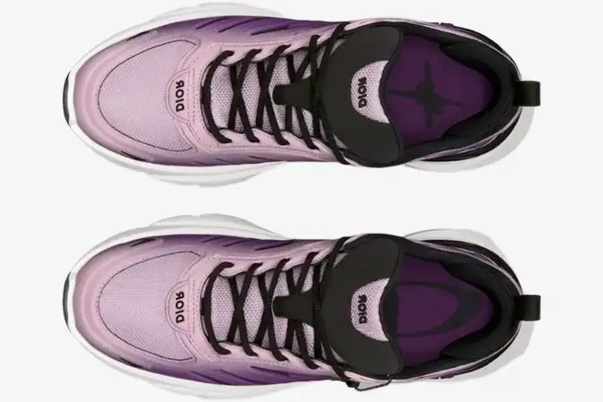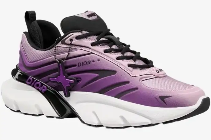 The upper utilizes breathable mesh paired with structured synthetic overlays for a lightweight yet supportive fit throughout the day. A chunky rubber sole provides a responsive foundation while maintaining the bold proportions synonymous with modern luxury footwear. The gradient effect transitions seamlessly from deep purple at the heel to crisp white at the forefoot. Functional pull tabs allow for easy entry, while the integrated lacing system ensures a secure lockdown during movement. Every element of this sneaker reflects the meticulous attention to detail required by both Dior and Lewis Hamilton.