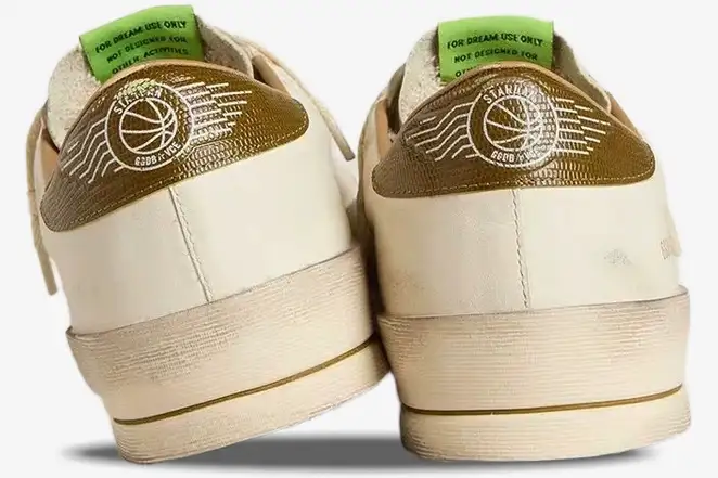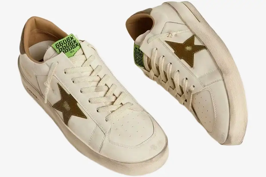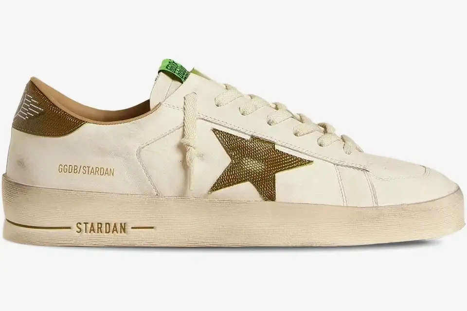 The Golden Goose Stardan in white leather with military-green snake-print accents redefines the classic basketball-inspired silhouette through a luxury lens.