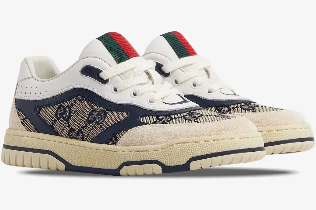 A striking blue Web stripe provides a sharp contrast, anchoring the design in Gucci’s storied equestrian history. This version stands out due to its intricate layering of textures and the deliberate placement of the house’s most recognizable motifs. The side panels feature the signature blue webbing, which complements the ivory leather overlays perfectly. This specific colorway utilizes a muted beige base to highlight the vibrant blue accents found throughout the upper construction.