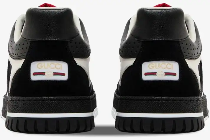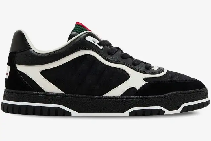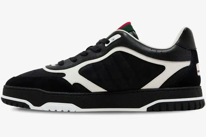Premium leather overlays reinforce the toe box and heel for enhanced durability and a structured aesthetic. The breathable canvas upper ensures comfort while maintaining the refined look of traditional Gucci craftsmanship. A robust rubber sole features a textured tread pattern for reliable grip and a cushioned feel during daily wear. Tonal black laces secure the fit while maintaining the sleek, high-fashion profile of this premium lifestyle sneaker. The combination of suede and leather accents adds depth to the dark palette of this specific Re-Web iteration.