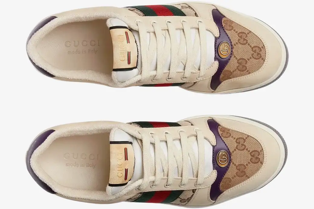 The Gucci Screener GC287 draws inspiration from classic 1970s trainers to deliver a premium vintage aesthetic. This specific iteration features a deliberate distressed finish that mimics years of authentic wear. It caters to collectors who value heritage design combined with modern luxury craftsmanship. The silhouette bridges the gap between retro sportswear and contemporary high-fashion styling.