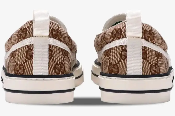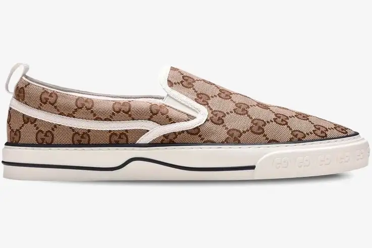 The vulcanized rubber sole provides a stable foundation and a responsive feel for all-day urban exploration. A reinforced toe cap protects the canvas upper from scuffs while adding a classic athletic touch. The pull tab at the heel allows for a quick transition from the street to the home. Designers incorporate a cushioned insole to support the foot during extended periods of wear. The white midsole features a contrasting stripe that mirrors the heritage colors of the brand. The Tennis 1977 collection draws inspiration from the brand’s deep roots in the sporting world. This slip-on iteration updates that vintage spirit with a focus on convenience and contemporary lifestyle needs. The GG Supreme canvas utilizes a low-impact material process to align with modern sustainability efforts. Its beige and brown colorway offers a neutral palette that complements a wide variety of high-end wardrobes. The rubber sole includes an embossed GG motif at the toe for subtle brand recognition. Designers include a green and red Web stripe detail on the side to honor traditional Gucci signatures. This combination of elements creates a sneaker that feels both nostalgic and ahead of its time. The internal composition features a soft fabric lining to enhance the overall comfort for the wearer. This shoe bridges the gap between formal luxury and casual street style effortlessly.