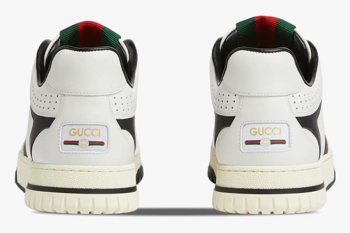 The Re-Web silhouette features the iconic green and red Web stripe integrated into the lateral and medial sides. This version utilizes a high-contrast white and black palette to emphasize the bold architectural lines of the upper. Every element reflects the brand’s commitment to quality and the evolution of its signature visual identity for a new era.