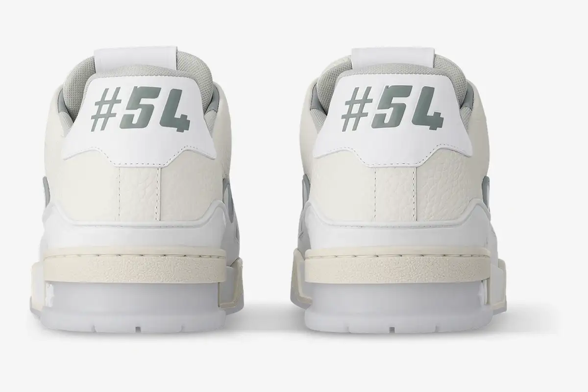 The #54 branding represents 1854, the founding year of Louis Vuitton, grounding this modern sneaker in historical context. This numerical detail distinguishes the edition from standard LV Trainer models and celebrates the longevity of the brand. The clean white colorway emphasizes the architectural lines of the upper, creating a versatile staple for any high-end wardrobe. The #54 signature appears in a bold, vintage-inspired font that mimics classic collegiate sportswear aesthetics.