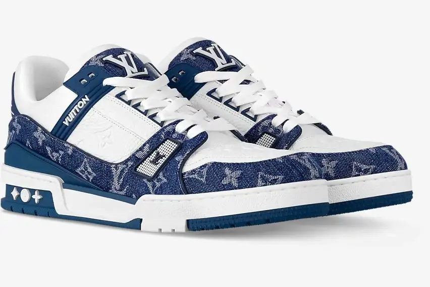 The upper features meticulously crafted Monogram denim that showcases the signature LV pattern in a striking blue hue. This textile choice provides a distinct texture that contrasts sharply against the smooth white leather overlays. Each pair requires seven hours of stitching to ensure the highest level of artisanal quality. The blue denim panels wrap the toe and heel to create a balanced visual composition. This material selection honors the heritage of the house while embracing contemporary street culture.