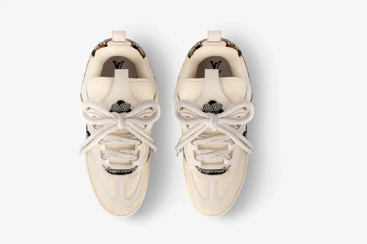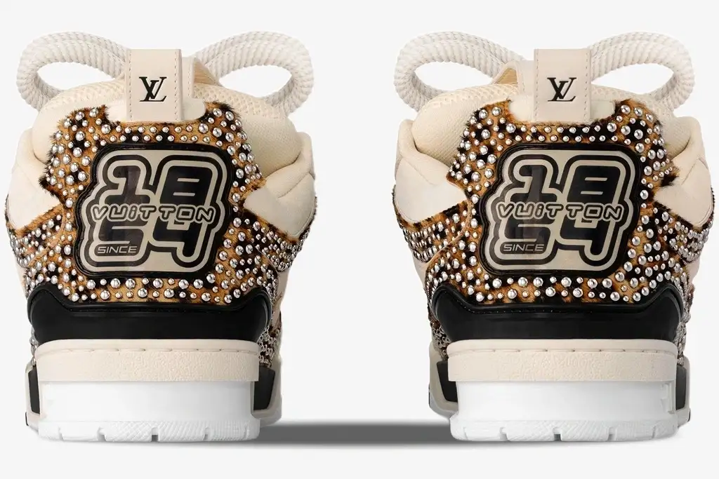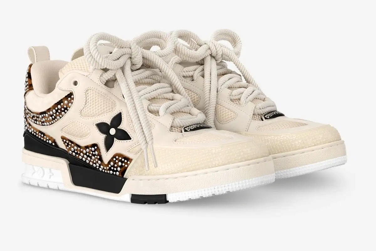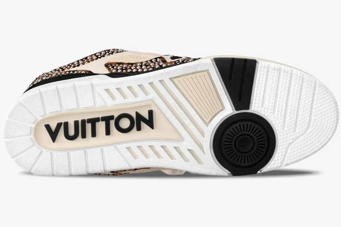 Premium beige suede provides a soft, textured base that contrasts with the durable black and brown leather components. A heavily padded collar supports the ankle while the breathable mesh lining ensures comfort during extended periods of wear. The technical rubber outsole features a bi-color design that mirrors the earthy tones of the upper construction. Every pair requires seven hours of stitching to achieve the precise finish expected from Louis Vuitton footwear. This version utilizes a sophisticated palette of beige, black, and brown to ground the rebellious studded embellishments. Gold-tone branding on the tongue and side panels adds a final touch of luxury to this unique release. The combination of materials ensures a long-lasting structure that retains its shape over time.
