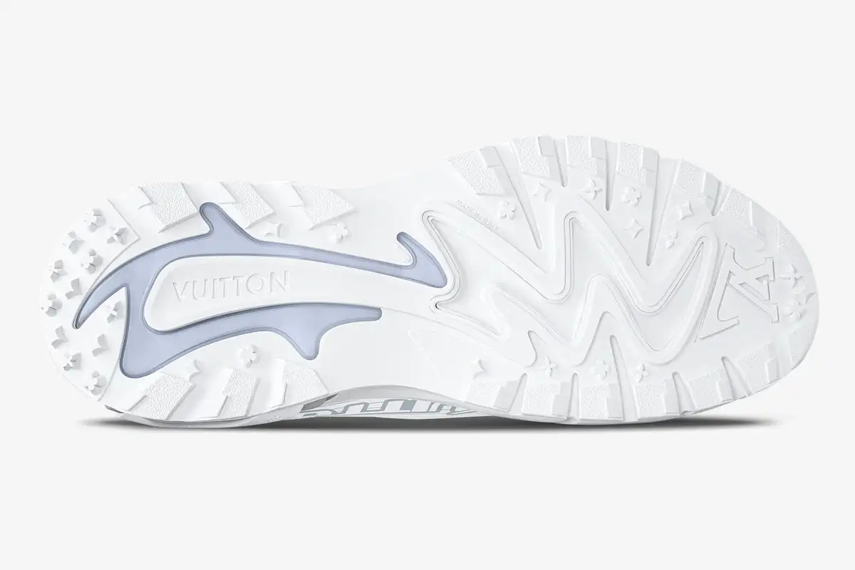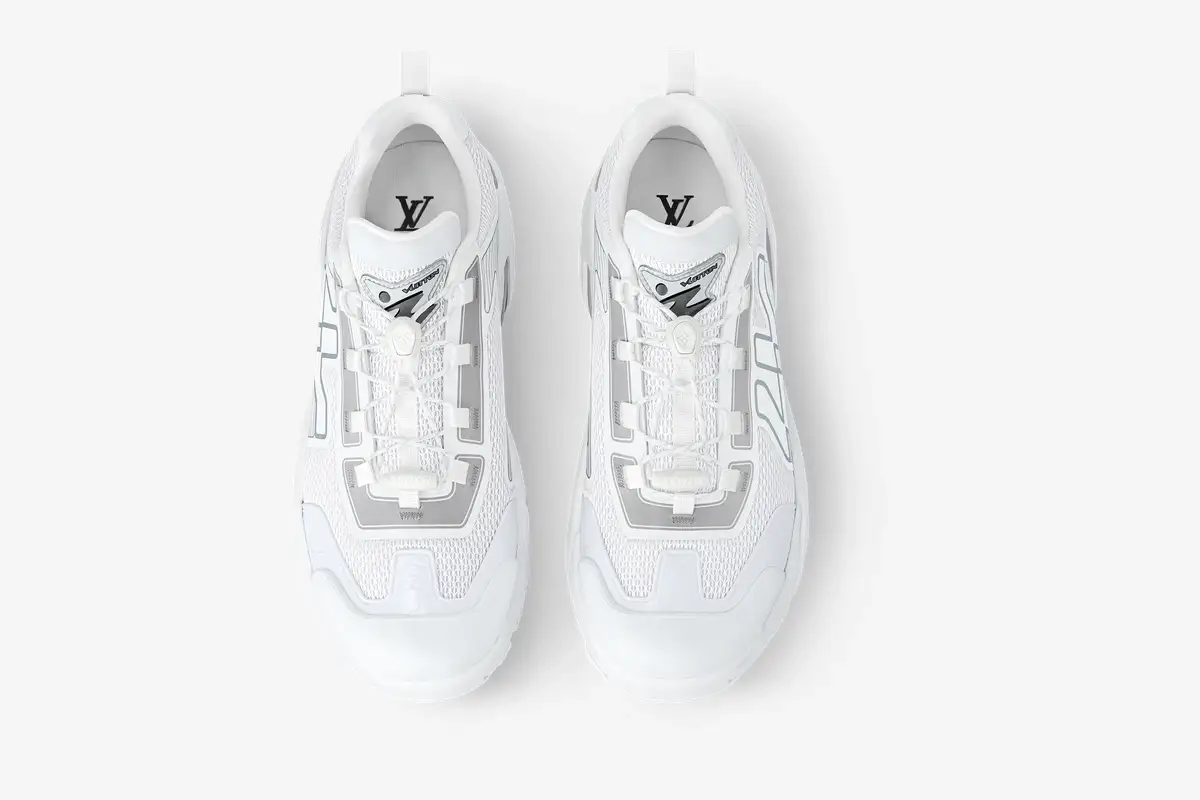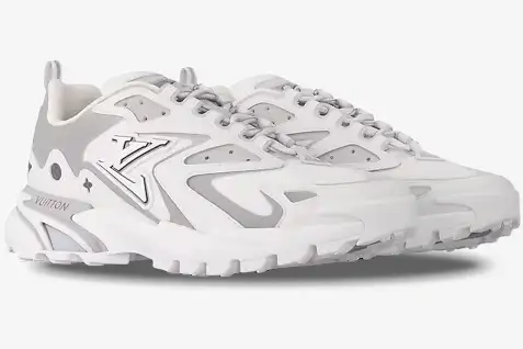 The White Grey edition showcases a sophisticated layering technique that highlights the dynamic profile of the shoe. LV branding appears prominently on the side panels, while the VUITTON signature marks the tongue and heel. These subtle grey accents provide a sharp contrast against the crisp white base for a refined look. Each pair features meticulous craftsmanship that reflects the high standards of the Louis Vuitton atelier. The design draws inspiration from vintage running shoes while maintaining a contemporary edge. Reflective details on the upper enhance visibility and add a technical dimension to the overall aesthetic.