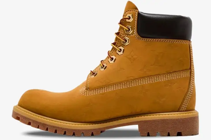 The Timberland 6-Inch Ankle Boot x Louis Vuitton represents a historic fusion of American workwear and French high fashion. This limited edition reimagines the iconic work boot through the lens of Pharrell Williams’ creative direction at Louis Vuitton. It caters to collectors who value rugged durability and luxury craftsmanship in a single, cohesive silhouette. Louis Vuitton integrates its signature aesthetic into the Timberland DNA with absolute precision and elegance. The upper features a subtle laser-etched Monogram pattern that covers the premium wheat nubuck material. Gold-tone hardware replaces standard eyelets to elevate the visual aesthetic of this utilitarian staple. A custom Louis Vuitton hangtag accompanies each pair to signify its status as a high-fashion collector piece.