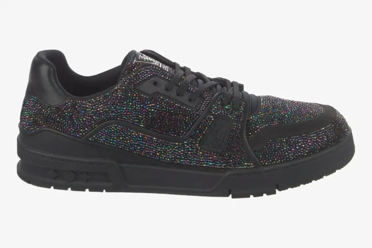 The multicolor rhinestones represent a bold departure from traditional sneaker materials and require precise hand-application techniques. This design choice elevates the LV Trainer from a performance-inspired shoe to a centerpiece of high-fashion luxury. The black leather trim anchors the design and provides a sophisticated frame for the brilliant crystal display. This juxtaposition of textures creates a tactile experience that defines the premium nature of the footwear.