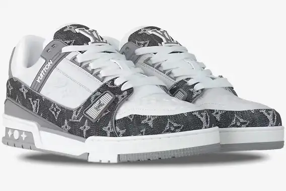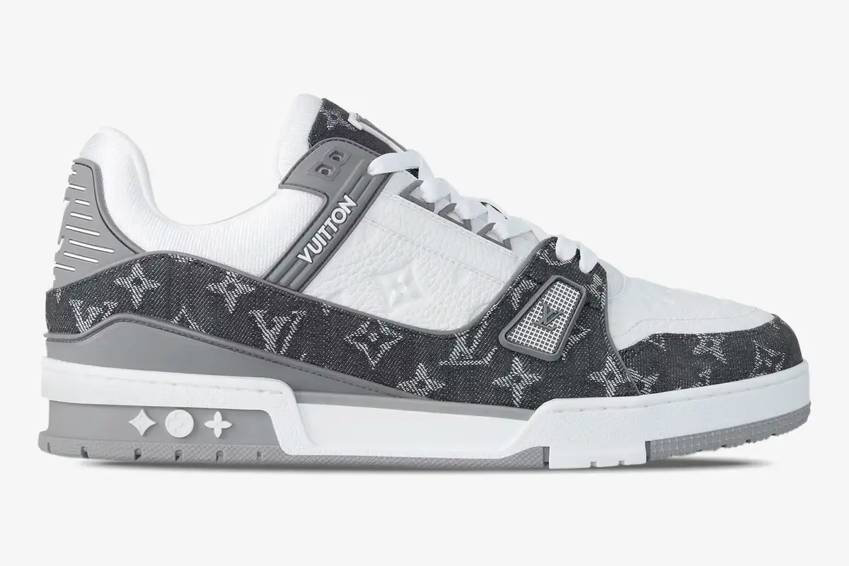 The grey and white palette offers a sophisticated contrast that distinguishes this release from standard leather versions. Each pair requires seven hours of meticulous stitching to ensure the highest quality standards. The upper combines supple calf leather with durable Monogram denim for a multi-textured appearance. This material choice provides a unique tactile experience while maintaining the structural integrity of the silhouette.