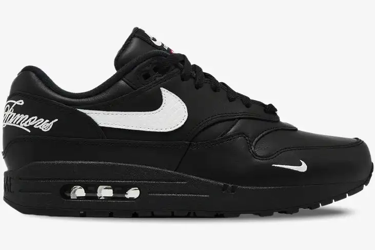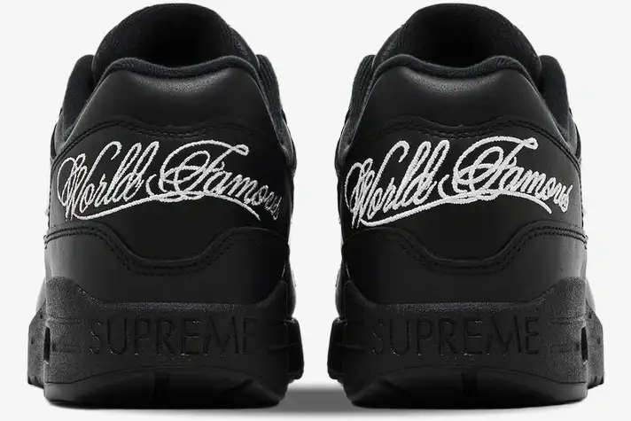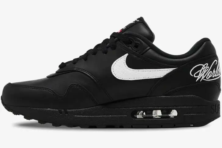 The “World Famous” slogan serves as a bold statement of the brand’s global influence and cultural dominance. This specific iteration utilizes a smooth leather finish that elevates the silhouette beyond its traditional mesh and suede roots. The monochromatic palette reflects the minimalist yet bold approach typical of Supreme’s premium footwear collaborations over the decades. Collectors recognize the mini swoosh as a hallmark of the most coveted Air Max 1 collaborations in sneaker history.