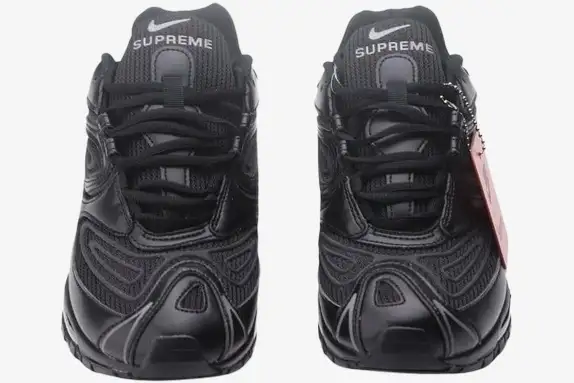 Supreme modifies the original 1998 tooling with a distinct, oversized branding treatment across the heel and tongue. The partnership introduces a distorted TPU frame that wraps the upper, creating a sense of constant motion. Reflective 3M accents highlight the collaborative logos, ensuring visibility during late-night city excursions. This specific iteration features a co-branded footbed and a custom hangtag that signifies its limited status. The molded mesh patterns on the side panels reflect the aggressive nature of the Supreme brand identity.