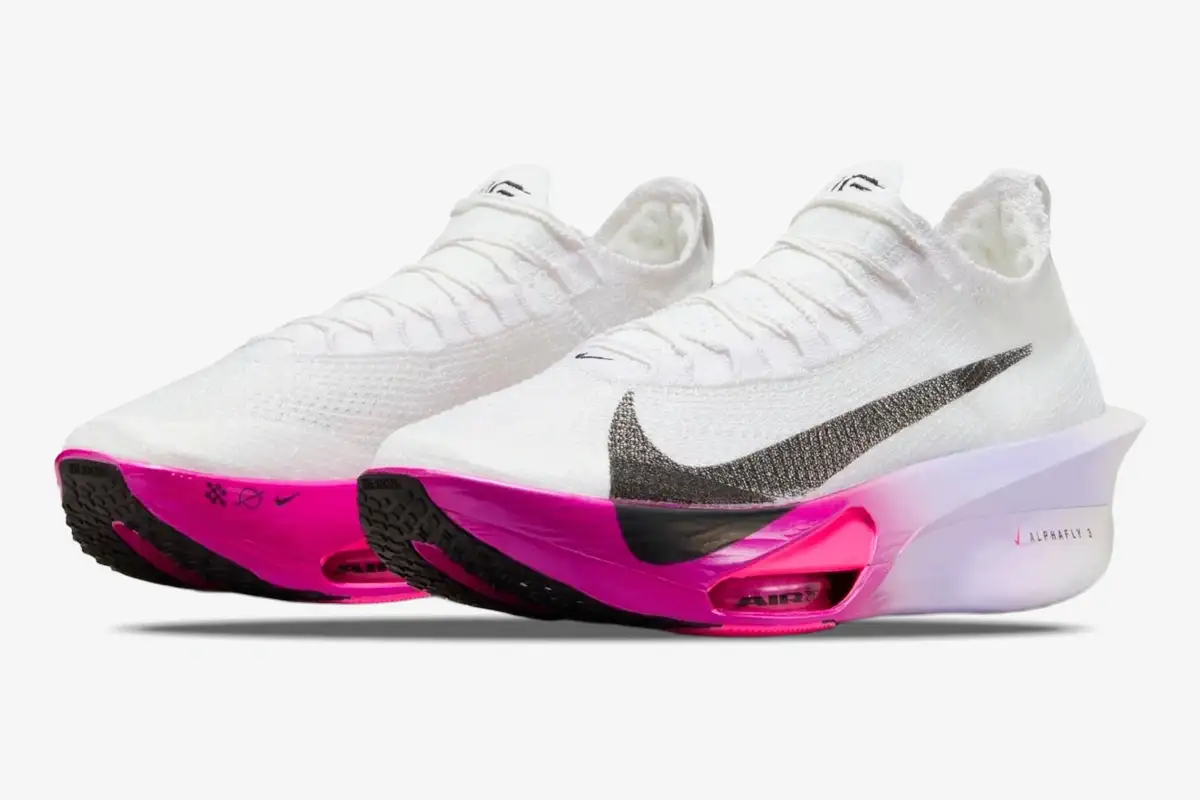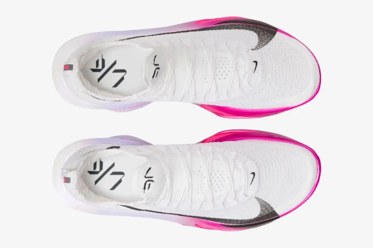 Dual Zoom Air units in the forefoot work with the carbon fiber Flyplate to propel every stride forward. The AtomKnit 3.0 upper provides a lightweight, breathable fit that secures the foot without adding unnecessary weight. Designers refined the midsole geometry to provide a wider base for improved confidence during sharp turns. The vibrant White, Pink, and Purple colorway creates a striking visual presence on the starting line.