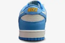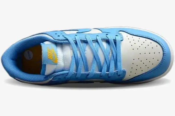 This version includes unique University Gold branding on the tongue and heel to provide a sophisticated pop of color. These subtle details elevate the sneaker beyond a standard release and reference iconic California team colors. Smooth white leather forms the base while bold blue overlays wrap the toe, eyestays, and heel. The University Gold accents act as a signature touch that separates this pair from general blue iterations.