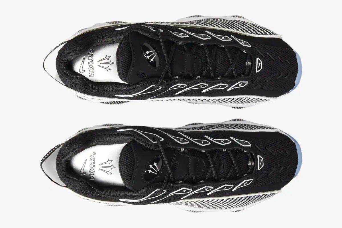 The NOCTA Glide features four distinct bug-eye pods along the midsole that command immediate visual attention. These design elements pay homage to classic court sneakers while incorporating carbon fiber-inspired finishes for a technical look. NOCTA branding appears prominently on the tongue and midsole to signify this exclusive partnership between the artist and the brand. The monochromatic Black and White palette ensures the sneaker remains versatile for any premium streetwear ensemble. Each pod reflects light differently, adding depth to the sculpted midsole architecture.