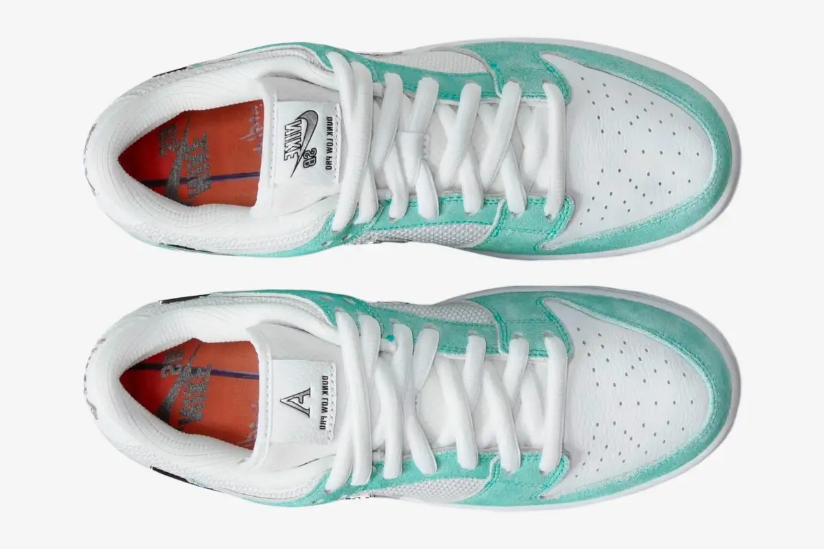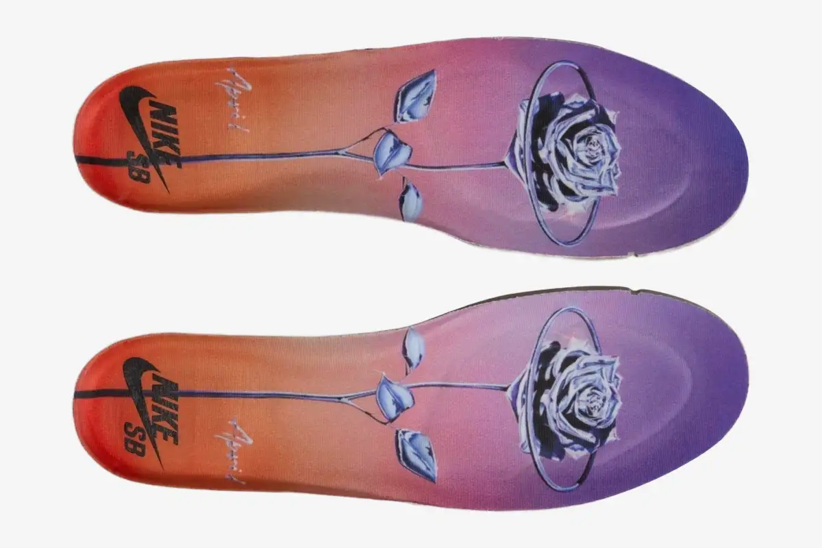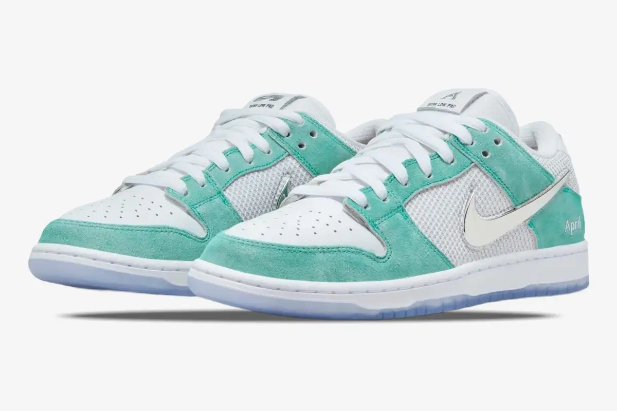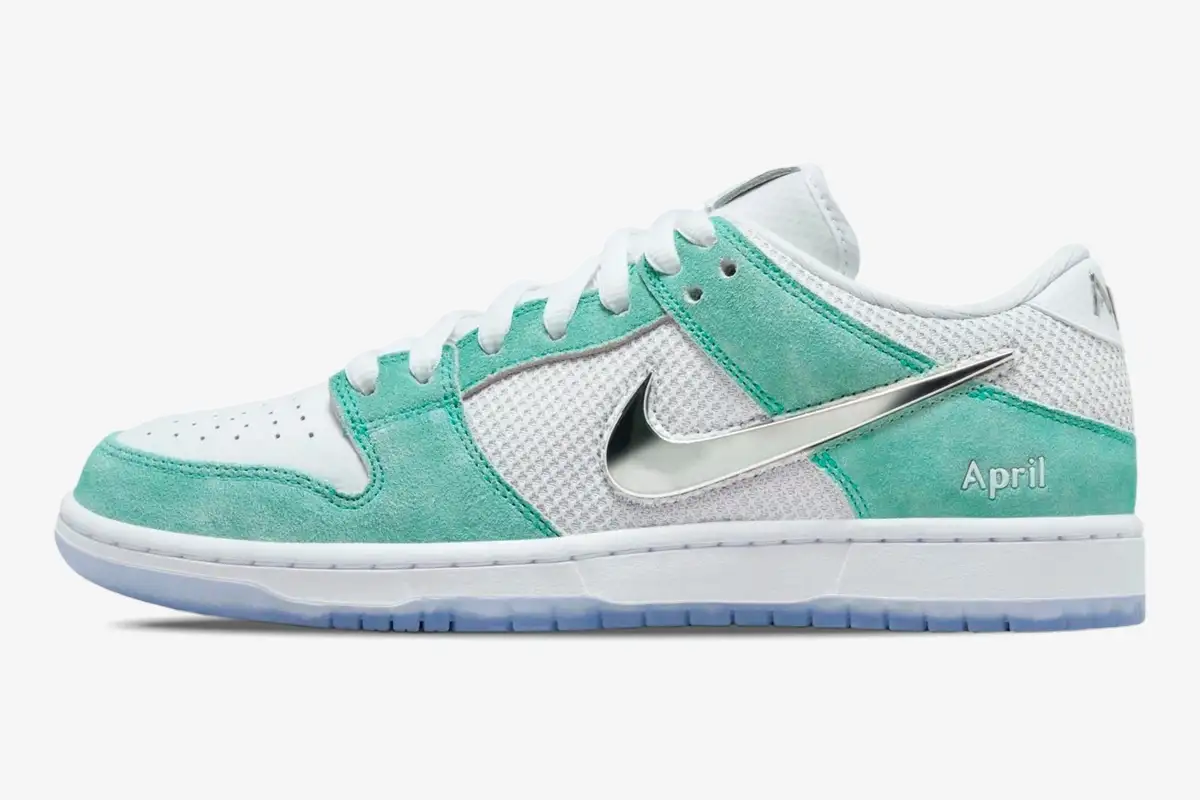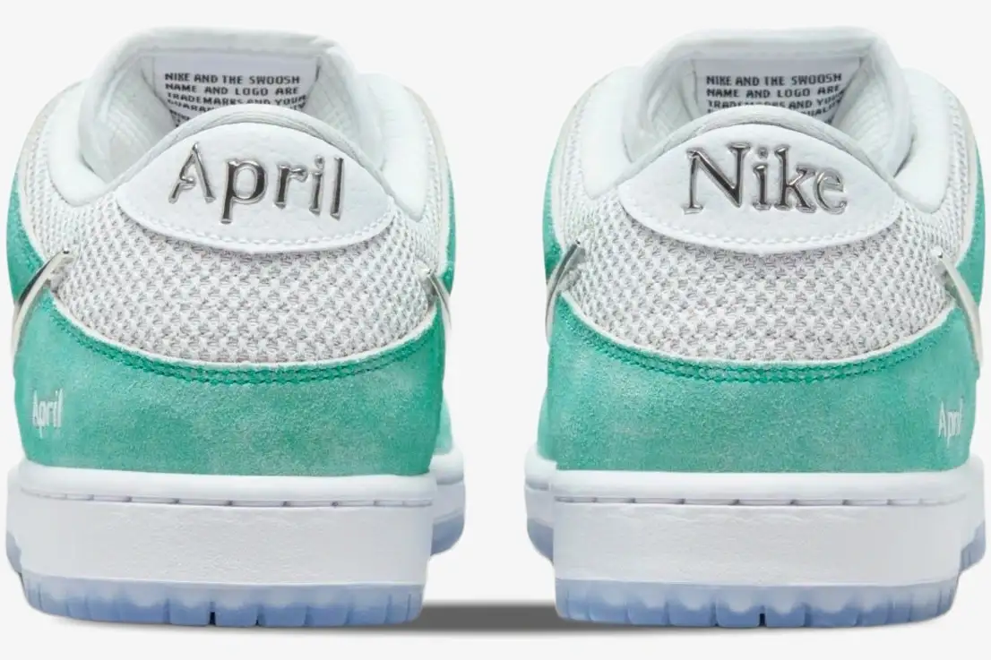 April Skateboards introduces a distinct visual language through the use of teal suede and metallic accents. The signature April branding appears prominently on the lateral heel and the translucent outsole. A striking metallic Swoosh defines the side profile, while the custom rose graphic sits beneath the clear rubber. The translucent outsole reveals an intricate rose graphic, a signature motif of the April Skateboards brand identity. This artistic detail transforms the bottom of the shoe into a canvas for Shane O’Neill’s creative expression. Silver accents on the heel tab complement the metallic Swoosh to create a cohesive, futuristic aesthetic.