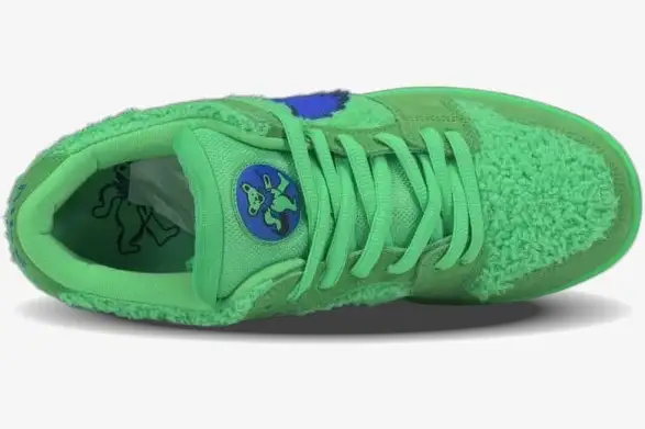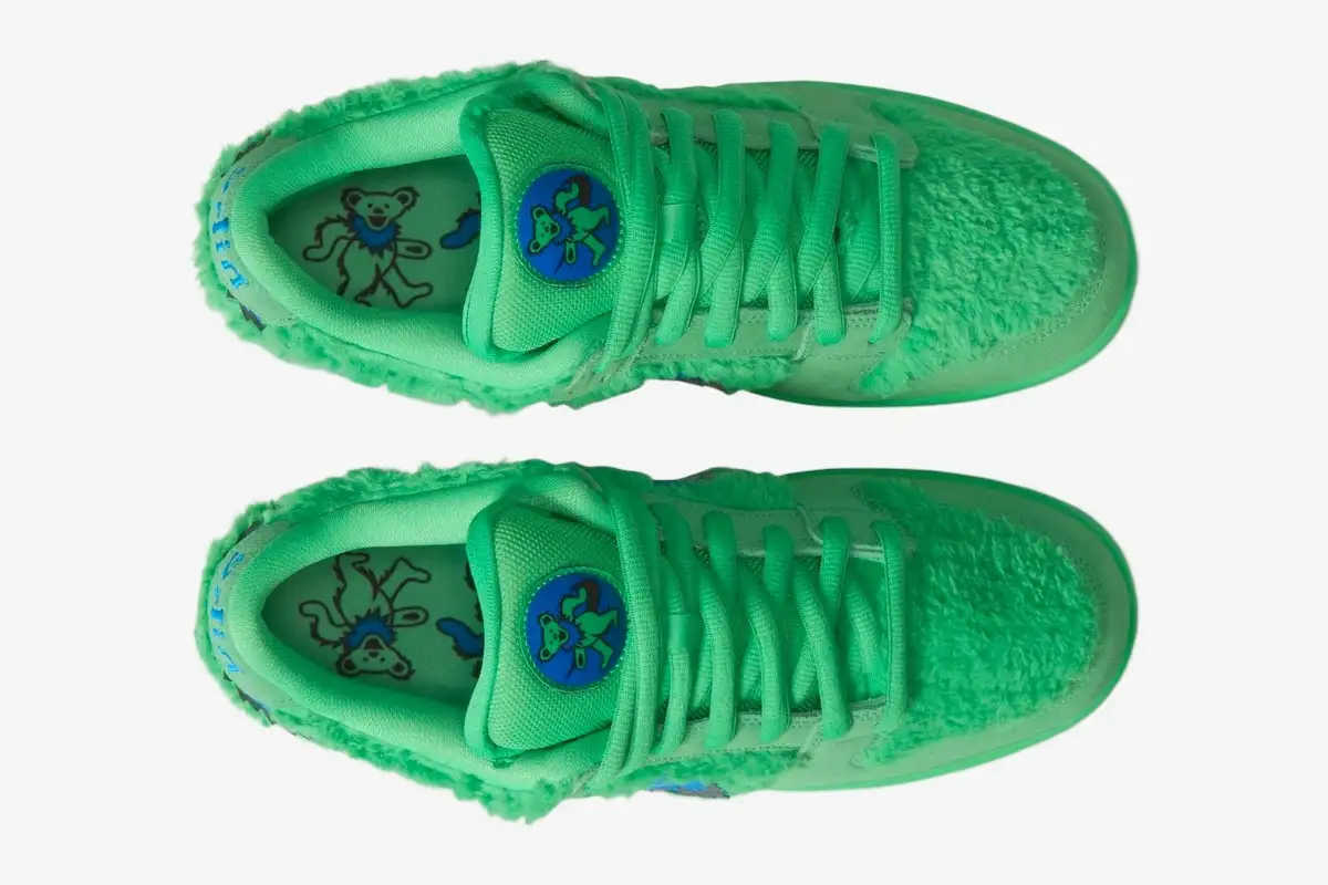 The collaboration features a fuzzy faux fur upper that mimics the texture of the iconic dancing bears. A jagged blue Swoosh represents the stylized fur collars worn by the characters on the classic album artwork. The tongue includes a hidden stash pocket, a signature detail that references the counterculture roots of the Grateful Dead. This pocket provides functional storage while maintaining the sleek silhouette of the traditional SB Dunk Low. The electric green colorway dominates the aesthetic, creating a visual statement that captures the energy of a live performance.