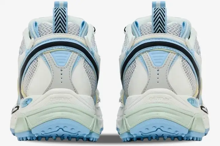 Off-White integrates its most recognizable motifs into this design to ensure immediate brand recognition. The signature plastic zip tie tag hangs from the laces as a testament to Virgil Abloh’s deconstructive philosophy. Large arrow logos decorate the lateral sides, providing a sharp contrast against the breathable mesh base. These elements transform a standard athletic shape into a piece of wearable contemporary art. The White Light colorway features a clean arrangement of white, blue, and black tones across the multi-textured panels.