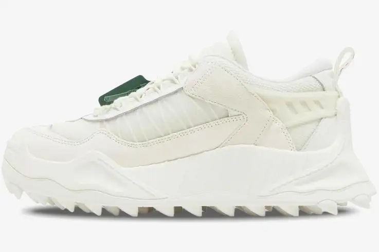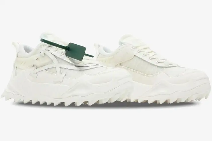 The design features the signature red plastic zip tie which remains a hallmark of the Off-White brand identity. Oversized tonal Arrows logos appear on the lateral sides to provide a bold yet sophisticated branding element. Industrial-style heel pull tabs feature woven branding that echoes the utilitarian themes found throughout the brand’s collections. These specific details ensure that the ODSY-1000 remains one of the most recognizable silhouettes in modern streetwear.